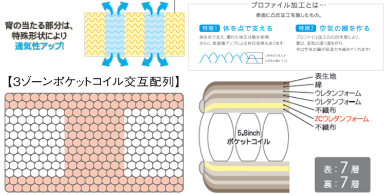 *メインの詰め物にZCウレタンを使用(プロファイル加工(凹凸)した特殊ウレタンを搭載)