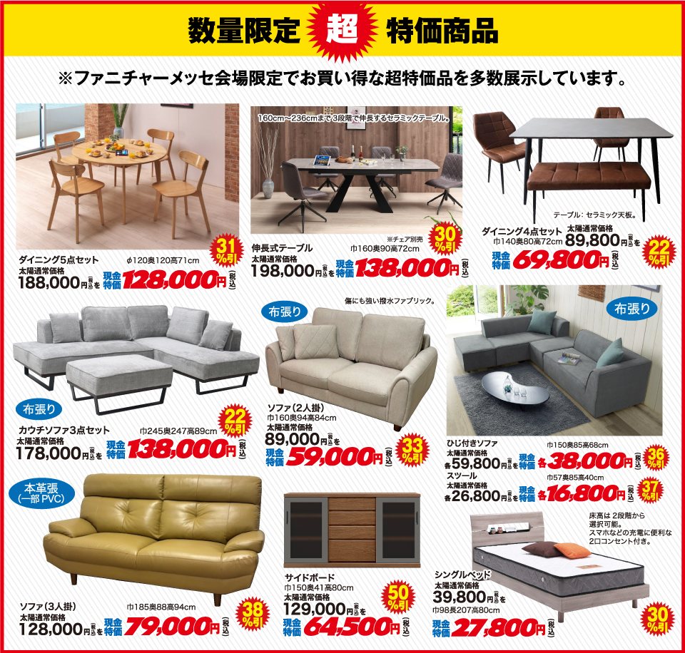 | 販売会社 | 株式会社太陽家具百貨店 ※イベントに関するお問合せは、電話・メールにてお願い致します。 ファニチャーメッセ係 電話 : 0836-21-8131 メール : wp.eigyo@taiyo-furniture.com |