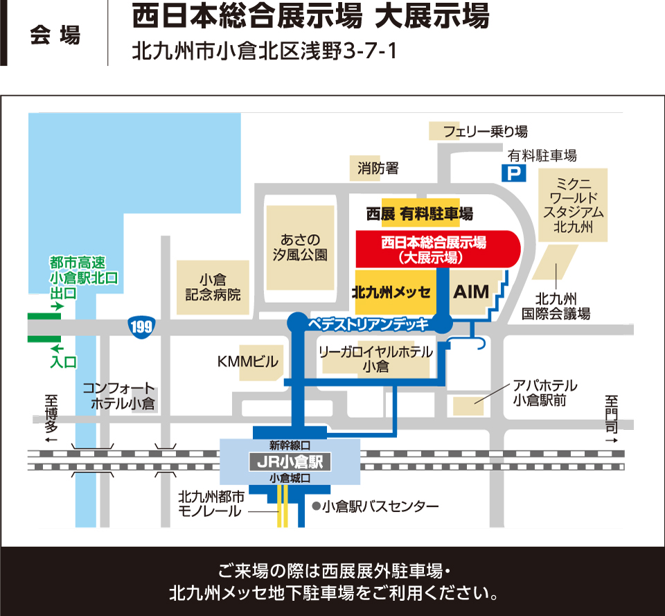| 駐車場 | 西日本総合展示場 屋外駐車場、または北九州メッセ地下駐車場をご利用ください。 |