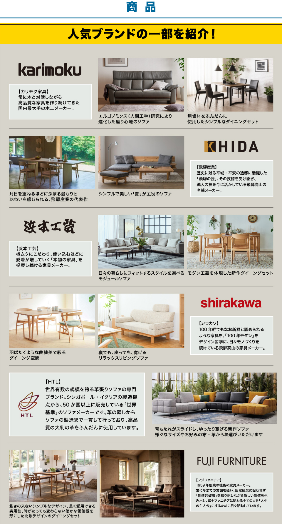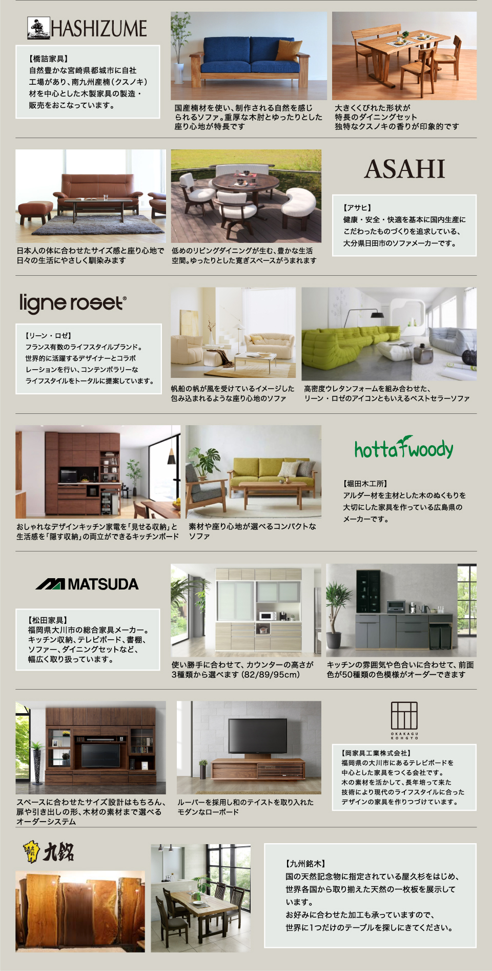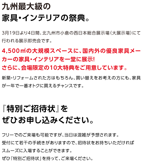 | 販売会社 | 株式会社太陽家具百貨店 ※イベントに関するお問合せは、電話・メールにてお願い致します。 ファニチャーメッセ係 電話 : 0836-21-8131 メール : wp.eigyo@taiyo-furniture.com |